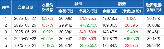 融资方面,当日融资买入1.37亿元,融资偿还1.2亿元,融资净买入1758.75万元。融券方面,融券卖出12.78万股,融券偿还11.66万股,融券余量170.18万股,融券余额922.38万元。融资融券余额合计30.18亿元。