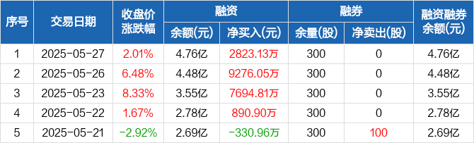 融资方面,当日融资买入1.23亿元,融资偿还9521.18万元,融资净买入2823.13万元,连续4日净买入累计2.07亿元。融券方面,融券卖出0股,融券偿还0股,融券余量300股,融券余额3201元。融资融券余额合计4.76亿元。