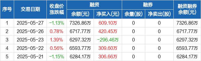 融资方面,当日融资买入964.21万元,融资偿还355.12万元,融资净买入609.1万元。融券方面,融券卖出0股,融券偿还0股,融券余量0股,融券余额0元。融资融券余额合计7326.86万元。
