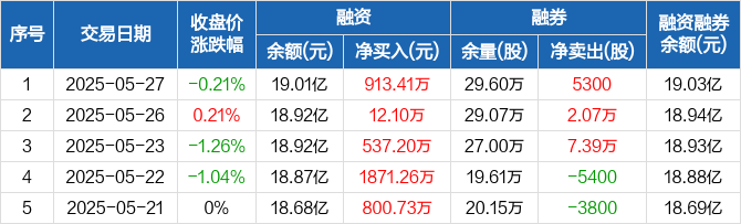 融资方面,当日融资买入2505.7万元,融资偿还1592.29万元,融资净买入913.41万元,连续5日净买入累计4134.71万元。融券方面,融券卖出1.4万股,融券偿还8700股,融券余量29.6万股,融券余额139.41万元。融资融券余额合计19.03亿元。