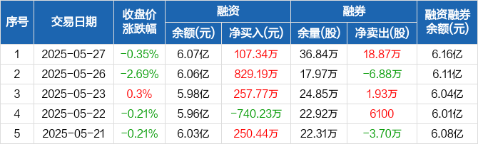 融资方面,当日融资买入1723.71万元,融资偿还1616.37万元,融资净买入107.34万元,连续3日净买入累计1194.3万元。融券方面,融券卖出19.83万股,融券偿还9600股,融券余量36.84万股,融券余额836.64万元。融资融券余额合计6.16亿元。