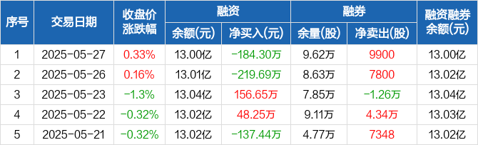 中泰证券融资融券信息显示,2025年5月27日融资净偿还184.3万元;融资余额13亿元,较前一日下降0.14%。
