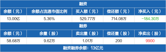 融资方面,当日融资买入529.77万元,融资偿还714.08万元,融资净偿还184.3万元。融券方面,融券卖出1.01万股,融券偿还200股,融券余量9.62万股,融券余额58.68万元。融资融券余额合计13亿元。