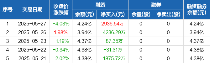 融资方面,当日融资买入4373.03万元,融资偿还1436.49万元,融资净买入2936.54万元。融券方面,融券卖出0股,融券偿还0股,融券余量0股,融券余额0元。融资融券余额合计4.24亿元。