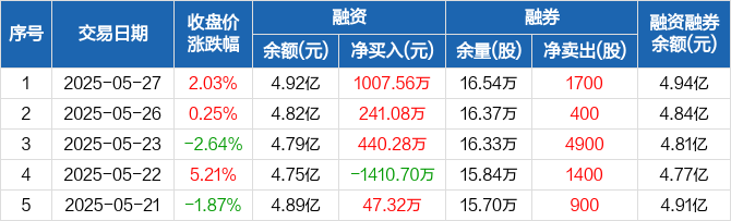 融资方面,当日融资买入4444.06万元,融资偿还3436.5万元,融资净买入1007.56万元,连续3日净买入累计1688.92万元。融券方面,融券卖出2.12万股,融券偿还1.95万股,融券余量16.54万股,融券余额199.64万元。融资融券余额合计4.94亿元。