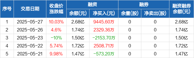 融资方面,当日融资买入2.11亿元,融资偿还1.16亿元,融资净买入9445.6万元,净买入额创历史新高,净买入额两市排名第12。融券方面,融券卖出0股,融券偿还0股,融券余量0股,融券余额0元。融资融券余额合计2.68亿元。