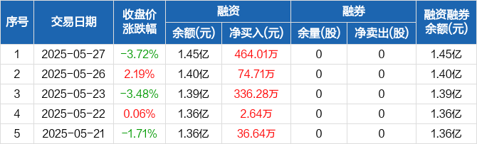 融资方面,当日融资买入1011.38万元,融资偿还547.36万元,融资净买入464.01万元,连续6日净买入累计1240.93万元。融券方面,融券卖出0股,融券偿还0股,融券余量0股,融券余额0元。融资融券余额合计1.45亿元。
