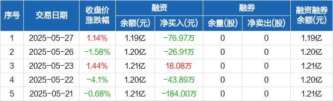 融资方面,当日融资买入273.05万元,融资偿还350.02万元,融资净偿还76.97万元。融券方面,融券卖出0股,融券偿还0股,融券余量0股,融券余额0元。融资融券余额合计1.19亿元。
