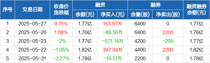 融资方面,当日融资买入568.52万元,融资偿还404.55万元,融资净买入163.97万元。融券方面,融券卖出0股,融券偿还0股,融券余量6400股,融券余额5.44万元。融资融券余额合计1.77亿元。