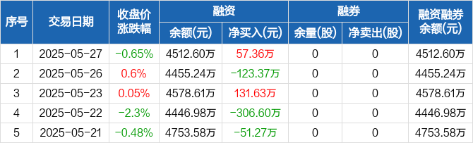 融资方面,当日融资买入91.48万元,融资偿还34.11万元,融资净买入57.36万元。融券方面,融券卖出0股,融券偿还0股,融券余量0股,融券余额0元。融资融券余额合计4512.6万元。