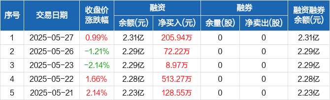 融资方面,当日融资买入430.29万元,融资偿还224.34万元,融资净买入205.94万元,连续5日净买入累计928.95万元。融券方面,融券卖出0股,融券偿还0股,融券余量0股,融券余额0元。融资融券余额合计2.31亿元。