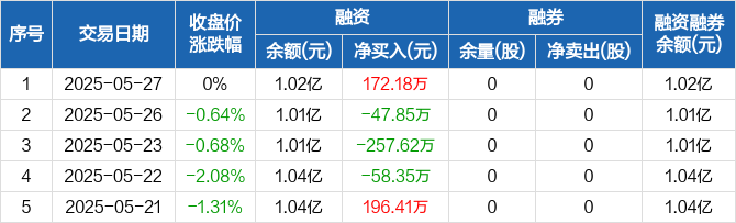 融资方面,当日融资买入388.13万元,融资偿还215.95万元,融资净买入172.18万元。融券方面,融券卖出0股,融券偿还0股,融券余量0股,融券余额0元。融资融券余额合计1.02亿元。