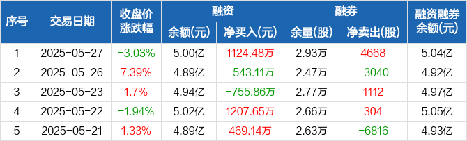 融资方面,当日融资买入2224.3万元,融资偿还1099.82万元,融资净买入1124.48万元。融券方面,融券卖出6000股,融券偿还1332股,融券余量2.93万股,融券余额375.62万元。融资融券余额合计5.04亿元。