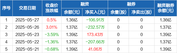 融资方面,当日融资买入591.38万元,融资偿还698.28万元,融资净偿还106.91万元。融券方面,融券卖出0股,融券偿还0股,融券余量0股,融券余额0元。融资融券余额合计1.36亿元。