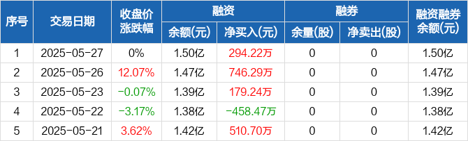 融资方面,当日融资买入1178.45万元,融资偿还884.22万元,融资净买入294.22万元,连续3日净买入累计1219.75万元。融券方面,融券卖出0股,融券偿还0股,融券余量0股,融券余额0元。融资融券余额合计1.5亿元。
