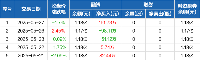 融资方面,当日融资买入266.43万元,融资偿还104.7万元,融资净买入161.73万元。融券方面,融券卖出0股,融券偿还0股,融券余量0股,融券余额0元。融资融券余额合计1.18亿元。