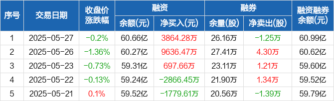 融资方面,当日融资买入1.28亿元,融资偿还8912.2万元,融资净买入3864.28万元,连续3日净买入累计1.42亿元。融券方面,融券卖出9000股,融券偿还2.15万股,融券余量26.16万股,融券余额3300.66万元。融资融券余额合计60.99亿元。