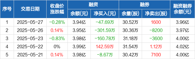 融资方面,当日融资买入874.63万元,融资偿还922.31万元,融资净偿还47.69万元,连续3日净偿还累计510.05万元。融券方面,融券卖出1600股,融券偿还0股,融券余量30.52万股,融券余额218.83万元。融资融券余额合计3.96亿元。