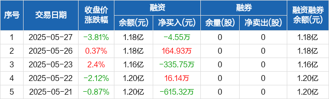 融资方面,当日融资买入742.19万元,融资偿还746.74万元,融资净偿还4.55万元。融券方面,融券卖出0股,融券偿还0股,融券余量0股,融券余额0元。融资融券余额合计1.18亿元。