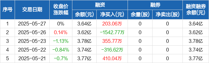 融资方面,当日融资买入1604.97万元,融资偿还1401.91万元,融资净买入203.06万元。融券方面,融券卖出0股,融券偿还0股,融券余量0股,融券余额0元。融资融券余额合计3.64亿元。