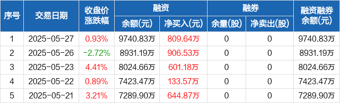 融资方面,当日融资买入3268.04万元,融资偿还2458.4万元,融资净买入809.64万元,连续5日净买入累计3095.8万元。融券方面,融券卖出0股,融券偿还0股,融券余量0股,融券余额0元。融资融券余额合计9740.83万元。