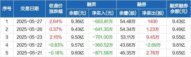 融资方面,当日融资买入2118.61万元,融资偿还2782.41万元,融资净偿还663.81万元,连续5日净偿还累计3238.26万元。融券方面,融券卖出7000股,融券偿还5600股,融券余量54.48万股,融券余额614.54万元。融资融券余额合计9.43亿元。
