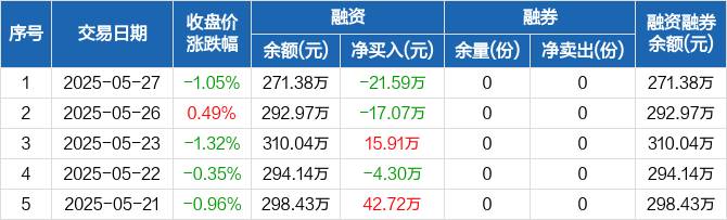 融资方面,当日融资买入9094元,融资偿还22.5万元,融资净偿还21.59万元。融券方面,融券卖出0份,融券偿还0份,融券余量0份,融券余额0元。融资融券余额合计271.38万元。