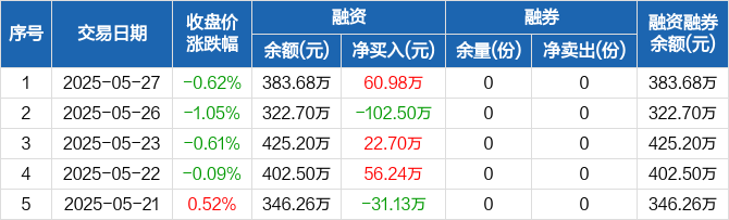 融资方面,当日融资买入61.54万元,融资偿还5569元,融资净买入60.98万元。融券方面,融券卖出0份,融券偿还0份,融券余量0份,融券余额0元。融资融券余额合计383.68万元。