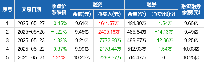 融资方面,当日融资买入9376.12万元,融资偿还7764.55万元,融资净买入1611.57万元。融券方面,融券卖出17.47万份,融券偿还22.01万份,融券余量481.3万份,融券余额425.47万元。融资融券余额合计9.65亿元。