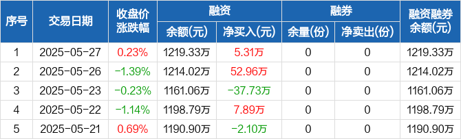 融资方面,当日融资买入154.17万元,融资偿还148.87万元,融资净买入5.31万元。融券方面,融券卖出0份,融券偿还0份,融券余量0份,融券余额0元。融资融券余额合计1219.33万元。
