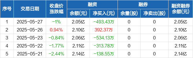 融资方面,当日融资买入527.71万元,融资偿还1021.14万元,融资净偿还493.43万元。融券方面,融券卖出0股,融券偿还0股,融券余量0股,融券余额0元。融资融券余额合计2.05亿元。