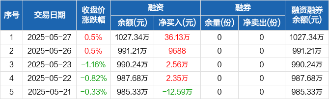 融资方面,当日融资买入155.72万元,融资偿还119.59万元,融资净买入36.13万元,连续4日净买入累计42.01万元。融券方面,融券卖出0份,融券偿还0份,融券余量0份,融券余额0元。融资融券余额合计1027.34万元。