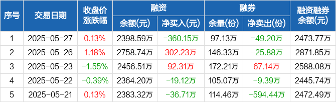融资方面,当日融资买入55.15万元,融资偿还415.3万元,融资净偿还360.15万元。融券方面,融券卖出12.13万份,融券偿还61.33万份,融券余量97.13万份,融券余额75.18万元。融资融券余额合计2473.77万元。