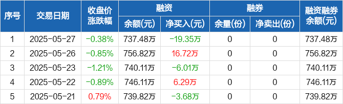 融资方面,当日融资买入9.77万元,融资偿还29.12万元,融资净偿还19.35万元。融券方面,融券卖出0份,融券偿还0份,融券余量0份,融券余额0元。融资融券余额合计737.48万元。