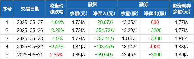 融资方面,当日融资买入1082.12万元,融资偿还1102.19万元,融资净偿还20.07万元,连续6日净偿还累计1670.74万元。融券方面,融券卖出700股,融券偿还100股,融券余量13.35万股,融券余额367.26万元。融资融券余额合计1.77亿元。