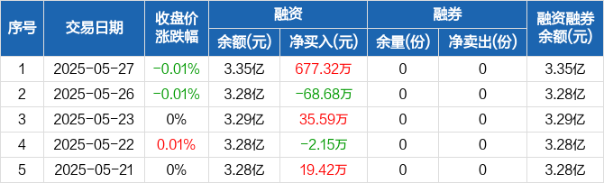 融资方面,当日融资买入753万元,融资偿还75.68万元,融资净买入677.32万元。融券方面,融券卖出0份,融券偿还0份,融券余量0份,融券余额0元。融资融券余额合计3.35亿元。
