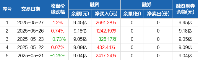 融资方面,当日融资买入3.29亿元,融资偿还3.02亿元,融资净买入2691.28万元。融券方面,融券卖出0份,融券偿还0份,融券余量0份,融券余额0元。融资融券余额合计9.45亿元。