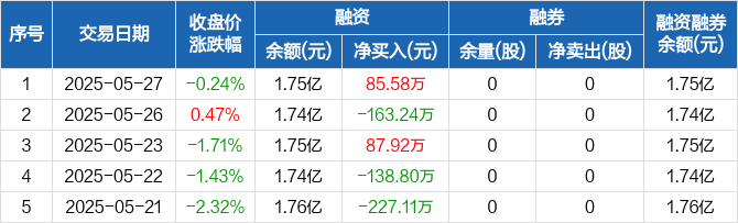 融资方面,当日融资买入892.17万元,融资偿还806.59万元,融资净买入85.58万元。融券方面,融券卖出0股,融券偿还0股,融券余量0股,融券余额0元。融资融券余额合计1.75亿元。
