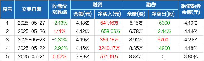 融资方面,当日融资买入2001.06万元,融资偿还1459.91万元,融资净买入541.16万元。融券方面,融券卖出2100股,融券偿还8400股,融券余量6.15万股,融券余额169.62万元。融资融券余额合计4.19亿元。