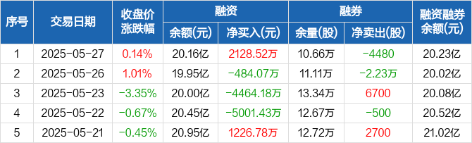 融资方面,当日融资买入7911.03万元,融资偿还5782.51万元,融资净买入2128.52万元。融券方面,融券卖出0股,融券偿还4480股,融券余量10.66万股,融券余额621.67万元。融资融券余额合计20.23亿元。