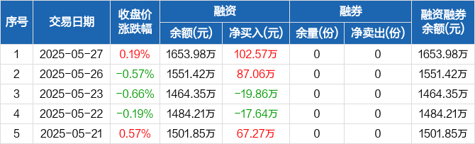 融资方面,当日融资买入191.09万元,融资偿还88.53万元,融资净买入102.57万元。融券方面,融券卖出0份,融券偿还0份,融券余量0份,融券余额0元。融资融券余额合计1653.98万元。
