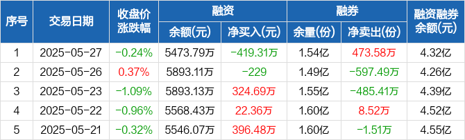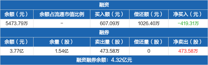 融资方面,当日融资买入607.09万元,融资偿还1026.4万元,融资净偿还419.31万元。融券方面,融券卖出473.58万份,融券偿还0份,融券余量1.54亿份,融券余额3.77亿元。融资融券余额合计4.32亿元。