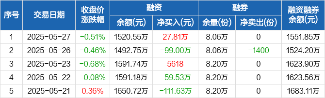 融资方面,当日融资买入37.81万元,融资偿还10万元,融资净买入27.81万元。融券方面,融券卖出0份,融券偿还0份,融券余量8.06万份,融券余额31.3万元。融资融券余额合计1551.85万元。