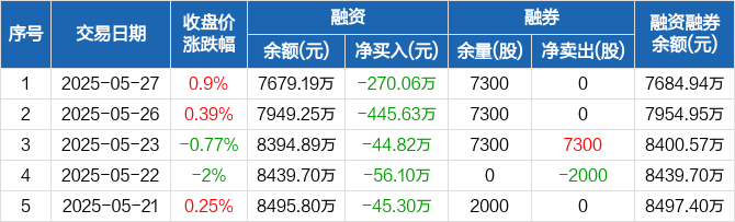 融资方面,当日融资买入189.05万元,融资偿还459.11万元,融资净偿还270.06万元,连续5日净偿还累计861.91万元。融券方面,融券卖出0股,融券偿还0股,融券余量7300股,融券余额5.75万元。融资融券余额合计7684.94万元。
