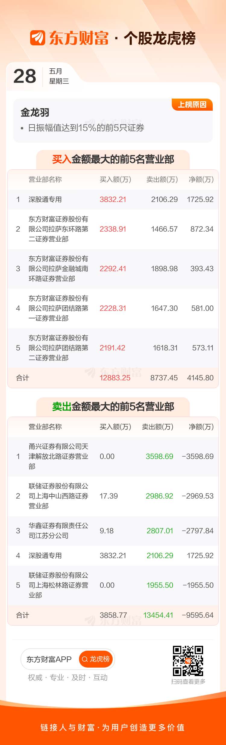交易所2025年5月28日公布的交易公开信息显示,金龙羽因成为日振幅值达到15%的前5只证券上榜。金龙羽当日收报25.48元,涨跌幅-2.56%,偏离值15.08%,换手率30.48%,成交额20.26亿。