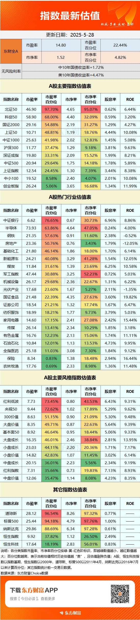 截至5月28日收盘,东方财富Choice数据显示,东财全A市盈率为14.8倍,市盈率百分位为22.44%;市净率为1.52倍,市净率百分位为4.82%。
