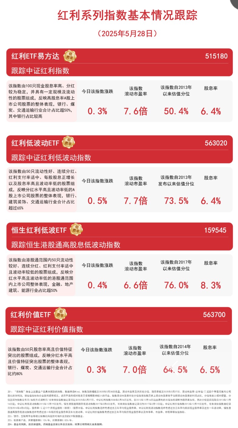 红利系列指数集体上涨,低费率的恒生红利低波ETF(159545)、红利ETF易方达(515180)等产品受关注