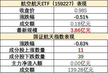 国防军工行业收跌0.72%,聚焦航空航天领域的国证航天指数下跌0.63%,航空航天ETF(159227)收跌0.20%,成交额达1788万元。