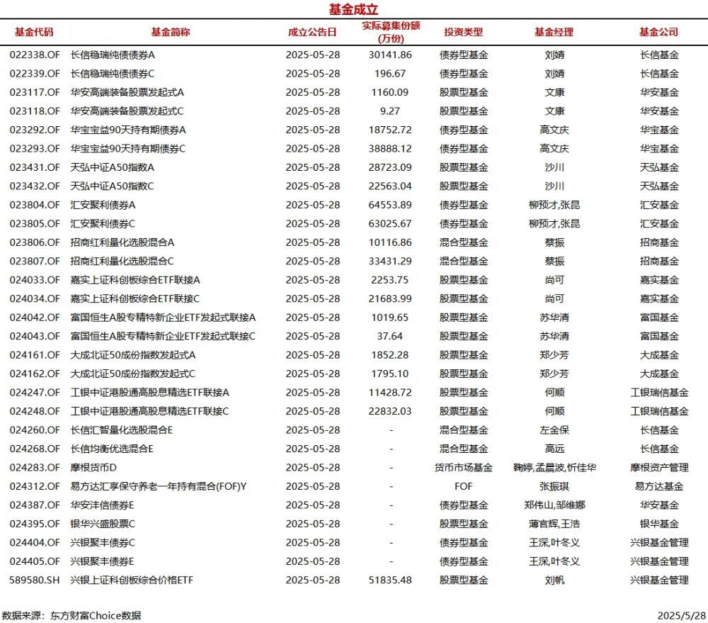 今日29只基金公告成立