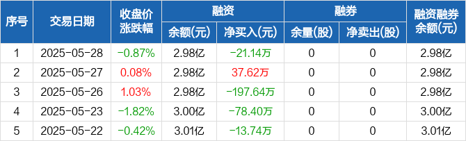 融资方面,当日融资买入392.25万元,融资偿还413.39万元,融资净偿还21.14万元。融券方面,融券卖出0股,融券偿还0股,融券余量0股,融券余额0元。融资融券余额合计2.98亿元。